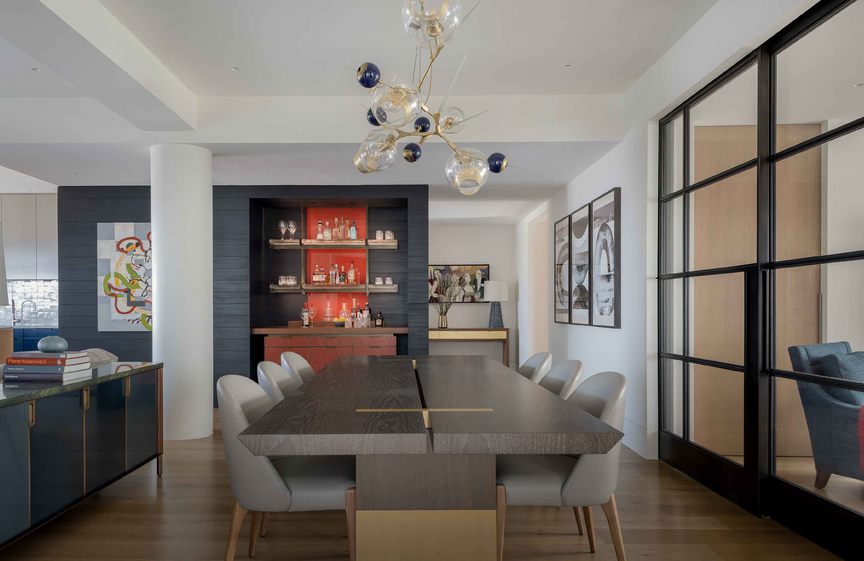 – Facing the dining area, it houses a spectacular inset bar of walnut, metal, lacquer, and cast glass